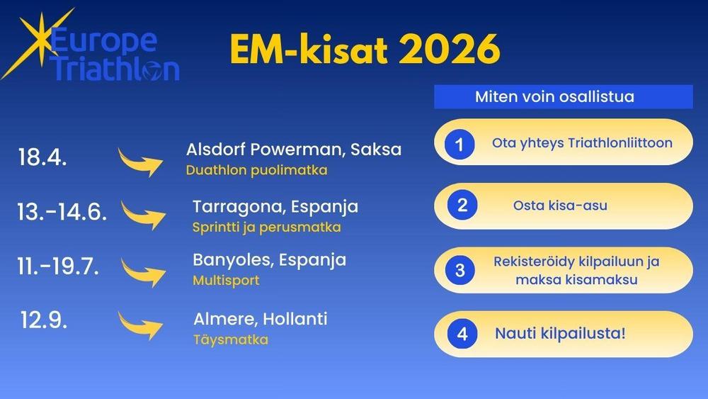 Ilmoittaudu kisoihin viimeistään 45 päivää ennen kisaa lähettämällä sähköpostia toimistolle (kaisa.tamminen@triathlon.fi)